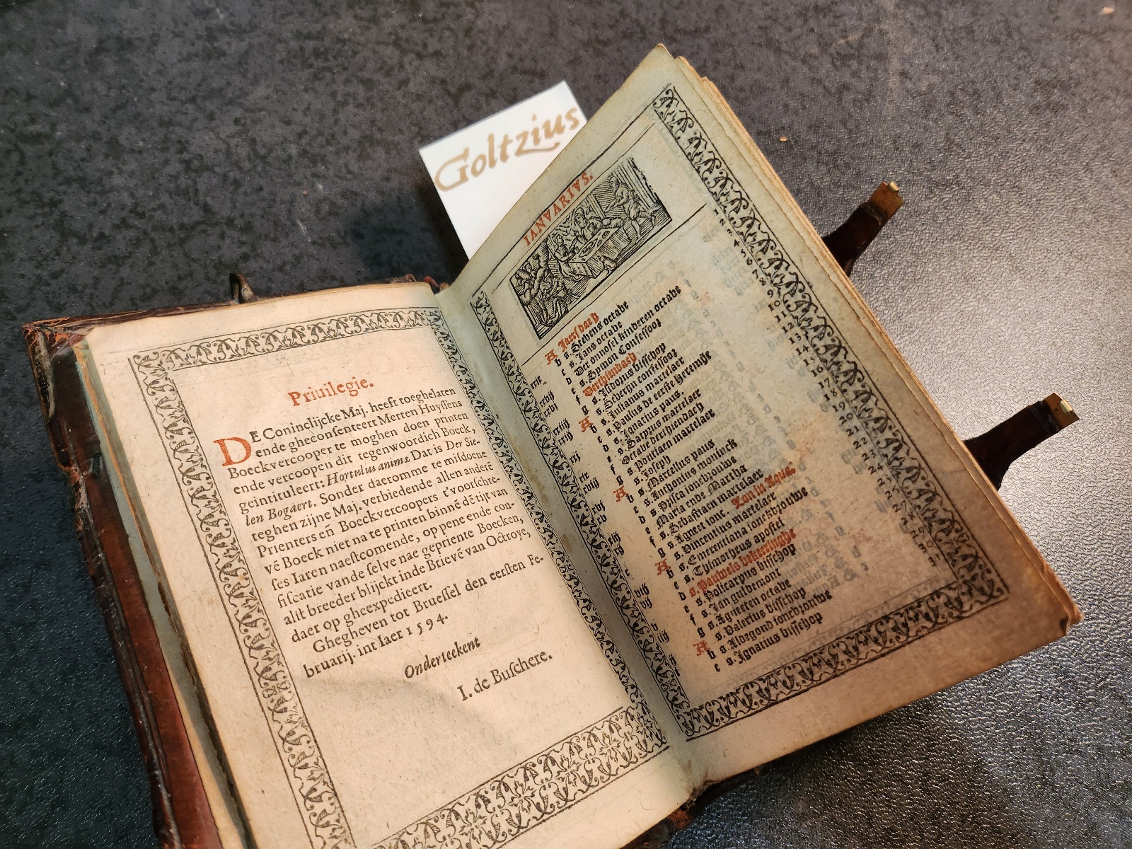 Cont. blindstamped calf leather with 6 (of 8) decorated messing cornerpieces, two square central pieces on both covers and two carefully restored clasps and catches. At the upper site of the covers two chain attachments, where a chain could be attached to carry the book. Both covers of the professionally restored binding are decorated with frames of flowers, lines and little portraits of saints. Beautiful early 17th-century binding, possibly originating from a (Belgian ?) monastery. 8o: pi 8 A – Hh 8 I 4, foliated: [8], CCXLVIII, [4]. Title printed in red and black. With 12 small woodcuts of the months and many woodcut text illustrations, 4 of which signed with the monogram HCvS, probably referring to Hans Christoffel van Sichem. With a 18th-century ownership mark by Martinus Martinus Jacobs, woende in den ee vent [convent?] tot Mechelen (dated 1713). The hortulus animae [little garden of the soul] was a popular prayer book, both in Latin and other languages in the sixteenth century. The first known edition was printed at Strasburg by William Schaffener of Rappeltsweiler in 1498. After that year new editions with various supplements and modifications were constantly issued by other printers. The present Dutch adaptation was made by the Belgian dominican author Damianus van den Houte (? – after 1577), and originally published in 1552. The popularity of this Dutch version is shown by the number of editions that followed, many of which were printed in Antwerp. In 1584 an edition appeared with woodcuts by Arnold Nicolai, which were used again in subsequent editions, i.g. the edition printed in 1606 by Jan van Keerberghen. The present copy, however, is printed after that Antwerp edition and is in fact printed later. The woodcuts by Nicolai are replaced by others, such as a series a woodcuts of the months which may well have been intended for use in a small type of almanac. Four of the other woodcuts are signed with the monogram HCvS, which bears great resemblance tot the well known monogram of Christoffel van Sichem. This monogram in no to be found in Nagler or any other of the usual reference works. However, a son of Christoffel van Sichem I by the name of Hans Christoffel van Sichem (born Johannes Christophorus in Basel, ca. 1580) was active in Leiden in the early 17th century. In 1603 he calls himself figuersnijder [woodcutter]. Forster suggests that he worked with his father and two other brothers (Christoffel II and Carel van Sichem) in some kind of a family company, first in Leiden and later in Amsterdam. These facts point to Leiden as the place of origin for the present edition of the Hortulus Animae, but further typographical research is necessary to unveal the anonymus printer. B0074. Binding; Religious; Rare; Woodcuts.