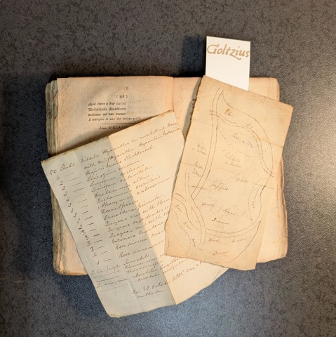 Utrecht, G.T. van Paddenburg, 1795, 8vo., sewn book block without binding, 8 + 580 pp. The front and back cover are lost. It seems to have been a plain paper binding. Remnants of the covering paper are visible on the spine. The top right corner of the first 14 pages has been gnawed on. On the titlepage this results in the loss of some letters of the first word, on the other pages there is no loss of text. The sewing of the book block is mostly intact. Uncut pages. This book was meant to have been bound to the taste of the buyer, but that never happened. The book has been used lovingly, as is made clear by the corrections, interesting notes in the margins, dried leaves and manuscipts (including two garden designs) inserted between pages 242-243, 498-499, and 516-517.