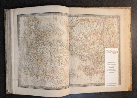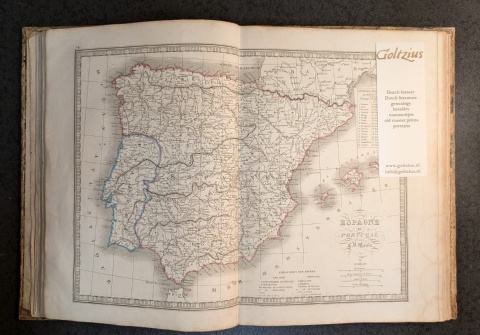 Paris, Jacques Lecoffre, [without date, possibly the 1850 edition], 34 x 24.5 cm, 40 maps, handcoloured in outline and a large tableau of the sizes of mountains. Half leather with decorative paper, spine skillfully rebacked, corners of the binding reinforced. The book is in good condition with a solid construction, there are some waterstains in the front and some discolouring due to newspaperclippings. The maps are in good condition, with only some sign of foxing and minor staining and without tears. The book comes with a restoration report (in Dutch).