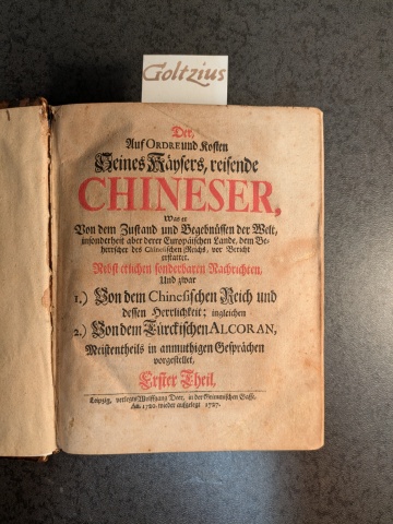 Leipzig, Wolffgang Deer 1720 (wieder ausgelegt 1727) 1720-1723 Quarto Full leather binding, ribbed spine, loosened headbands 1284 pages, plus register. Periodical with travel descriptions issued from 1721 until 1733, this is the first volume, containing 27 issues plus register. China, Chinese.