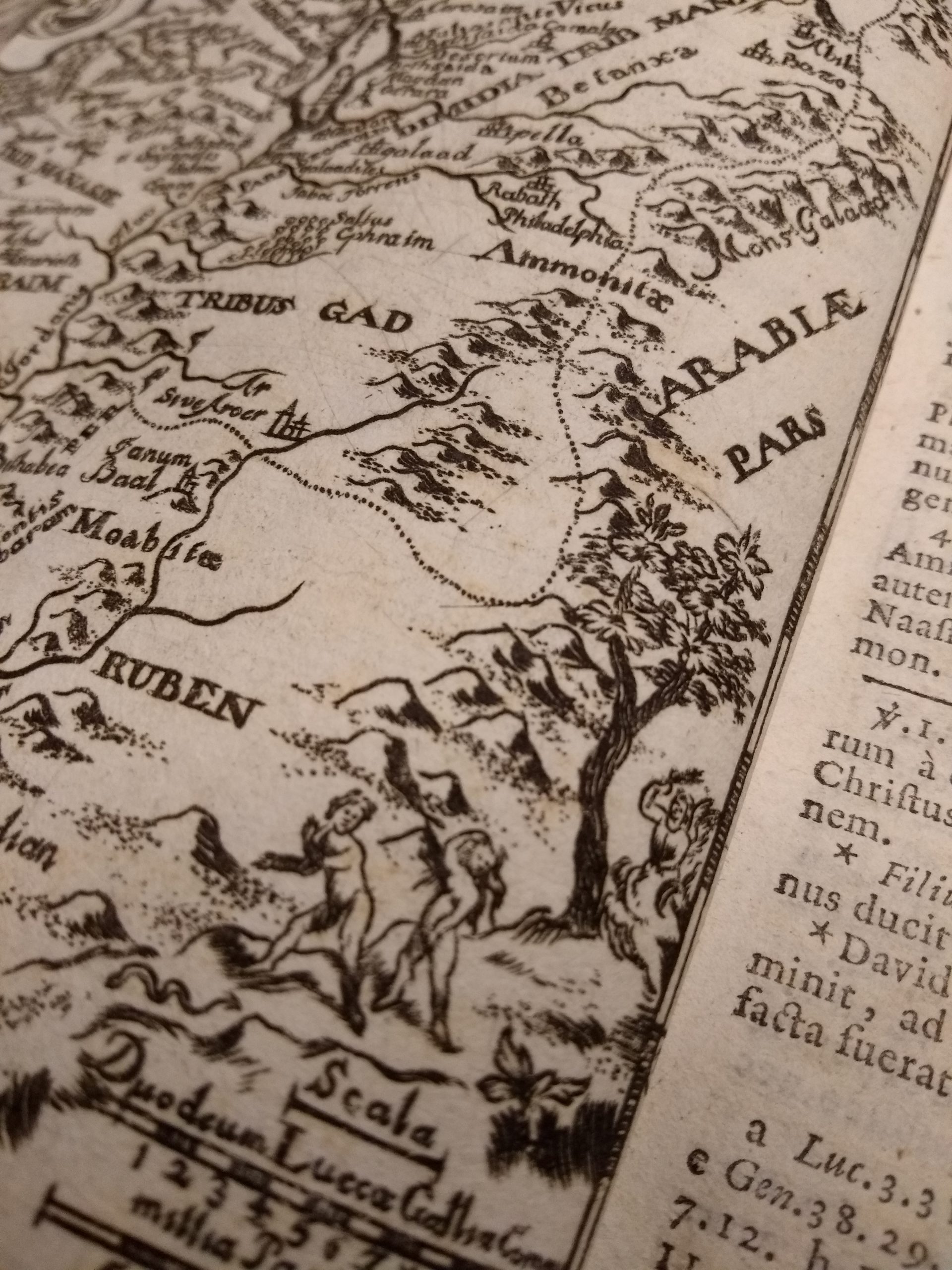 Paris (Lutetiae Parisiorum), Florentinum de Laulne, 1739, 12mo., modern blue paper cover, red coloured edges, 384 pp.,some stains but otherwise in good condition, decorative head and tail pieces, two beautifully engraved pull out maps (one entitled ‘Terra Sancta’, the other ‘Tabula serviens actibus Apostolorum’), contemporary handwritten note in Latin before title page, library stamp (Bibliotheca Buscoduci)