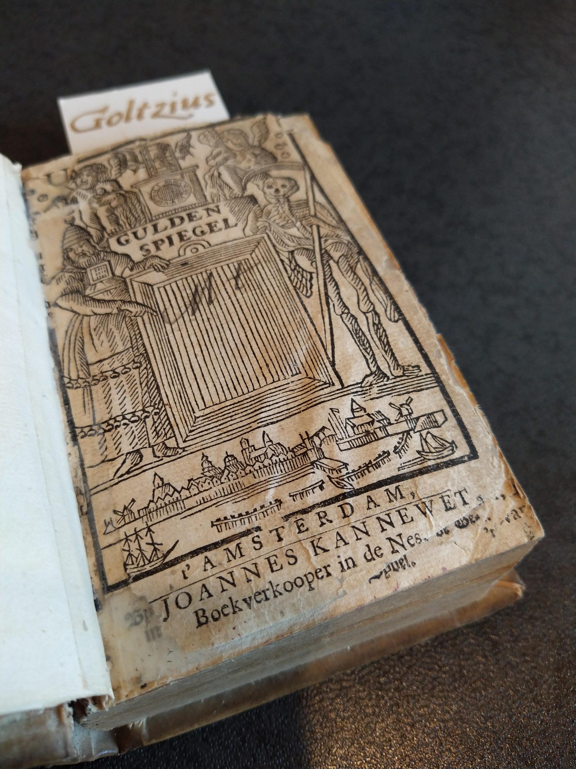Amsterdam, Joannes Kannewet, [1763], 8vo., full parchment spitsel binding, 246+[4]+52+206 pp., on the outside the parchment binding is in good condition, on the inside there is considerable damage: the hinges are broken and restoration tape has been used to keep a number of pages in place, in the front as well as in the back. Furthermore, the titlepages have damaged corners (reinforced with restoration tape), the bookblock has been cut too close to the printwork creating a very small margin and sometimes loss of letters, woodcut titlepage preceding the typographical titlepage, printer's mark on typographical titlepage (woodcut), woodcut tailpieces, woodcut illustrations throughout the book (one illustration – depicting a mermaid's tail – turns up twice). Each title has it's own titlepage with woodcut illustration.