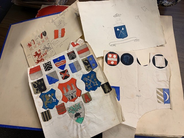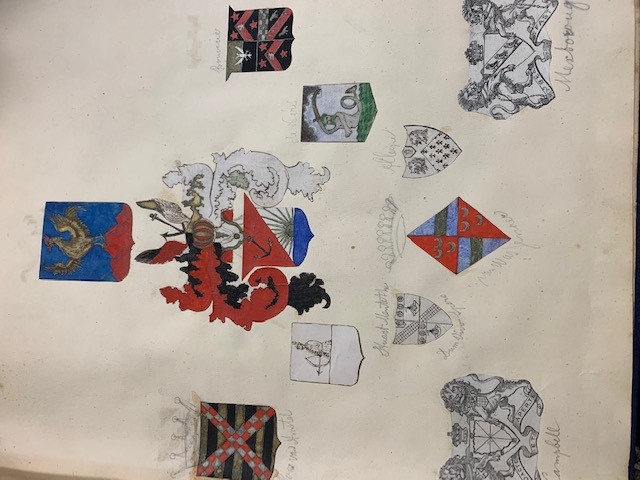 Scraps-book, with 15 pages with each several handpainted coats of arms of Dutch and foreign families, names mentioned amongst many others: Alberdingk Thijm, Vingrhoedt, Schuurman, Spengler, Ros, Hoormans, Boom, Nispen, Schoutens, Rensdorp, Carp, Van Leeuwen etc Possibly from the workshop of an heraldic painter.