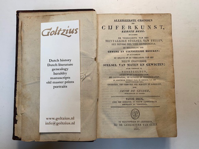 's Gravenhage/Amsterdam, Gebroeders Van Cleef, 1837-1838-1839, 5th edition, complete three parts in one volume with as third part ‘Antwoorden (…)’, 3rd edition, 's Gravenhage/Amsterdam, Gebroeders Van Cleef, 1839, written by Gerrit Ramakers (-ca. 1865), xxiv,176,(3)+xii,228+iv,96 pages, full tooled leather binding, gilt lettering and ornaments on spine, half page waterstain on first 20 pages, the author Jacob de Gelder (1765-1848) was professor in mathematics in Leiden, early and extensive work on the essence of mathematics, with the scarce third part containing the answers to the calculations presented in the first two parts, interesting book.