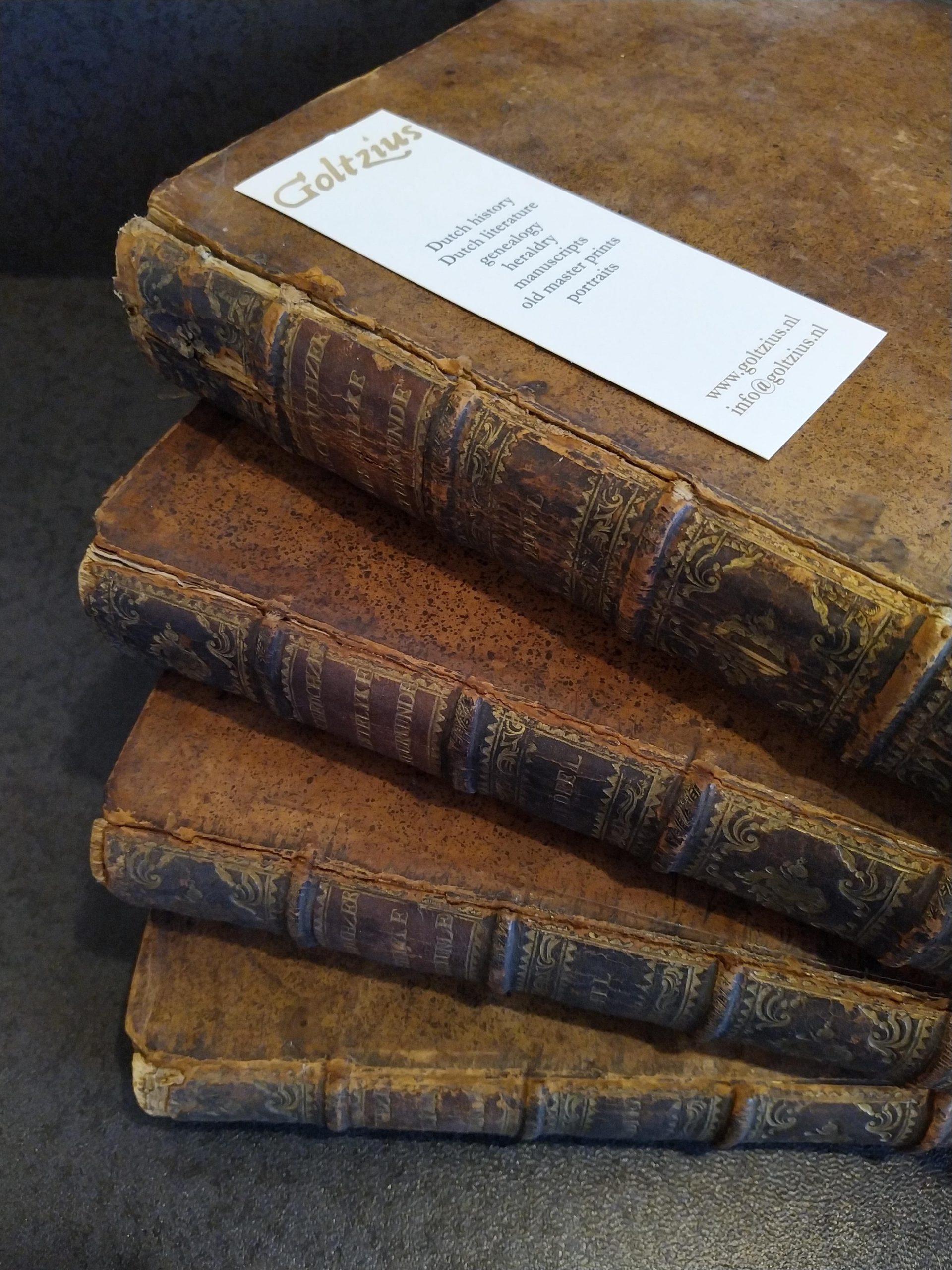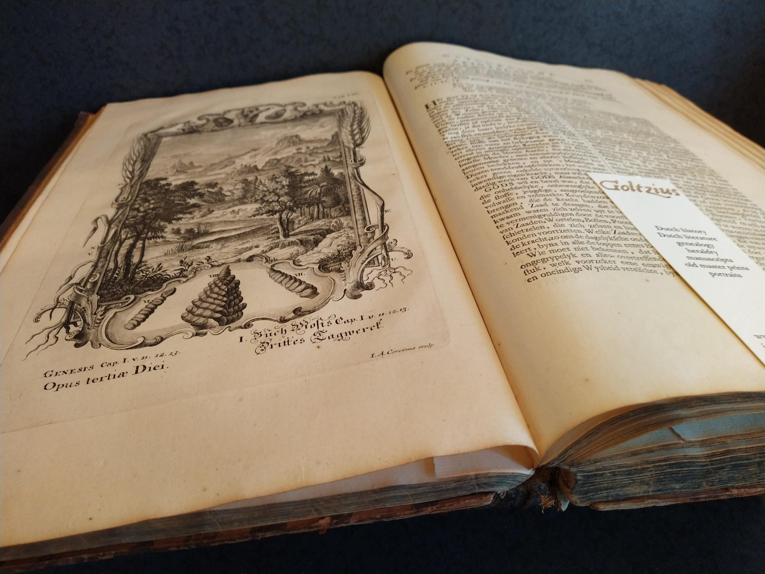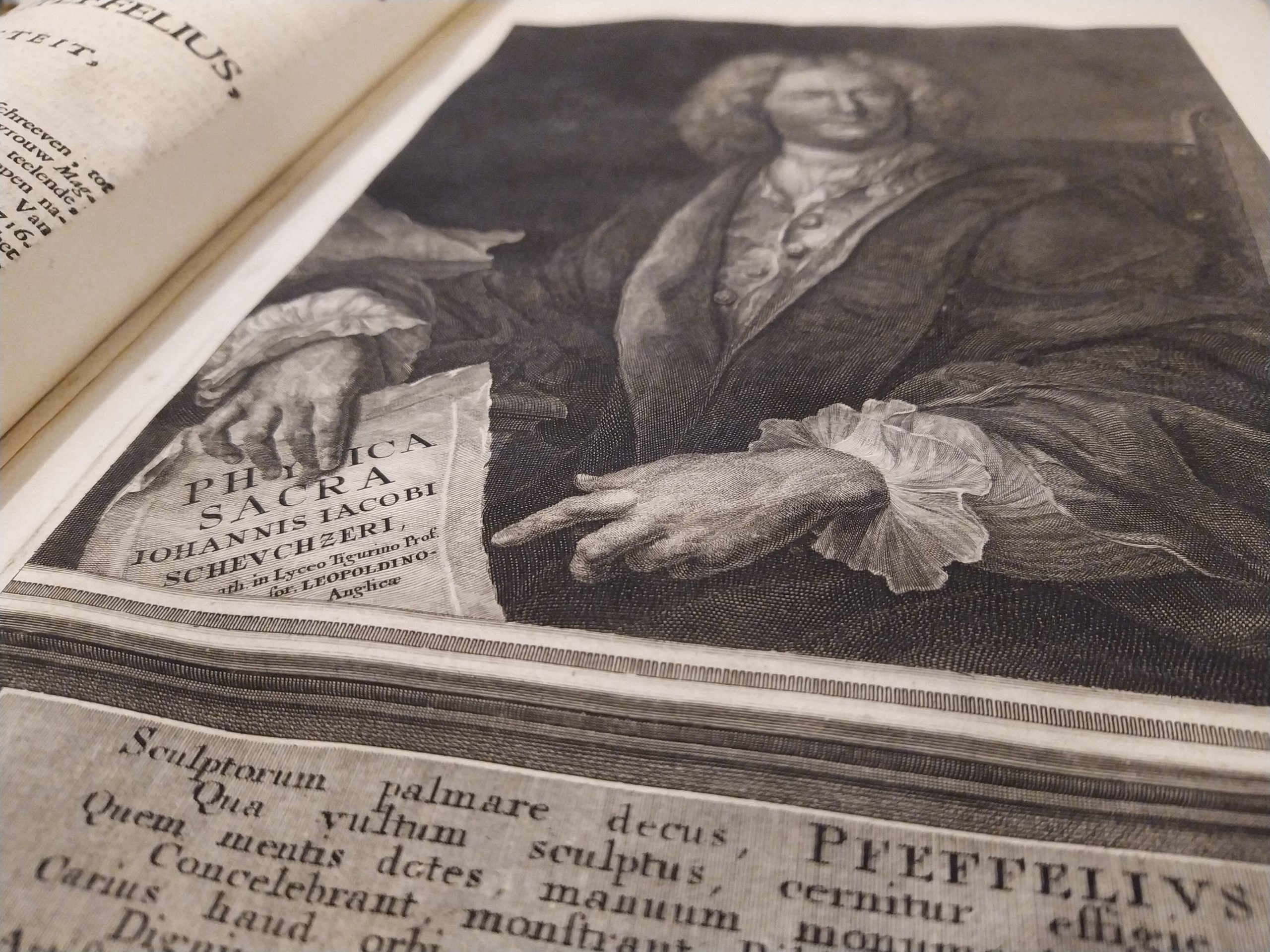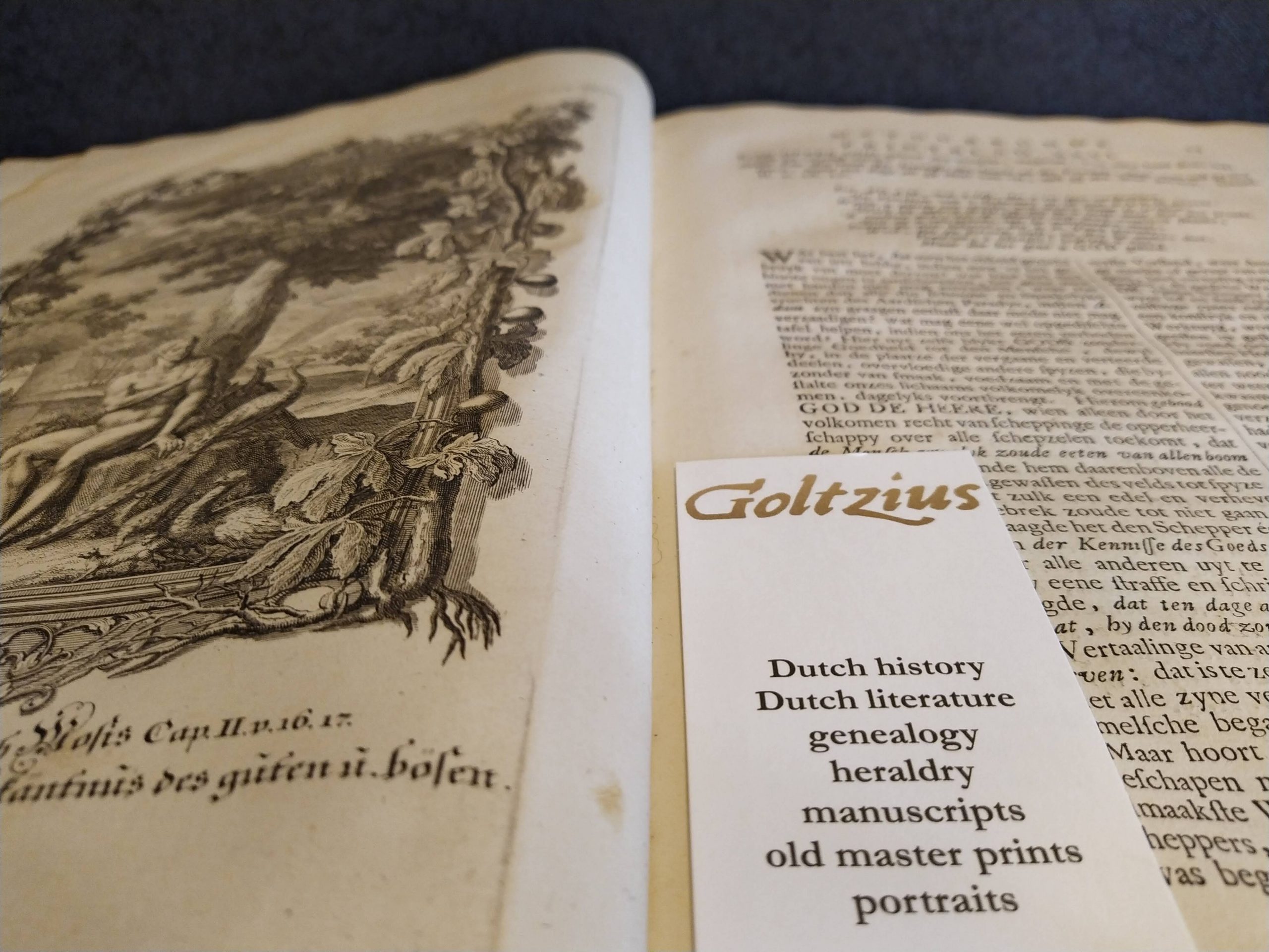 I) [48]+151 pp,, volume 1 and 2, frontispiece: Soli gloria (Joh. Daniel Preusler del., Hieronymus Sperling sculps.), portrait (mezzotint) of Scheuzer (I.H. Heidegger pinx., T. Laub sculp.), portrait (mezzotint) of Pfeffelius (Georg. de Marees pinxit, Ioan. Georg. Pintz sculp.), richly decorated with numbered engravings outside of the collation (1-100) by various artists (I.A. Friderich, I.A. Corvinus and M. Tyroff among others), with contemporary handwritten note on the front flyleaf: ‘Deertien banden van Scheutzers geestelijke natuurkunde, op een auctie gehouden anno April 1779 in 't heere logement Orange in de Lange Delft te Middelburg voor mij ingekocht voor fl. 30:5:1 door den boekverkooper Van de Sanden’.