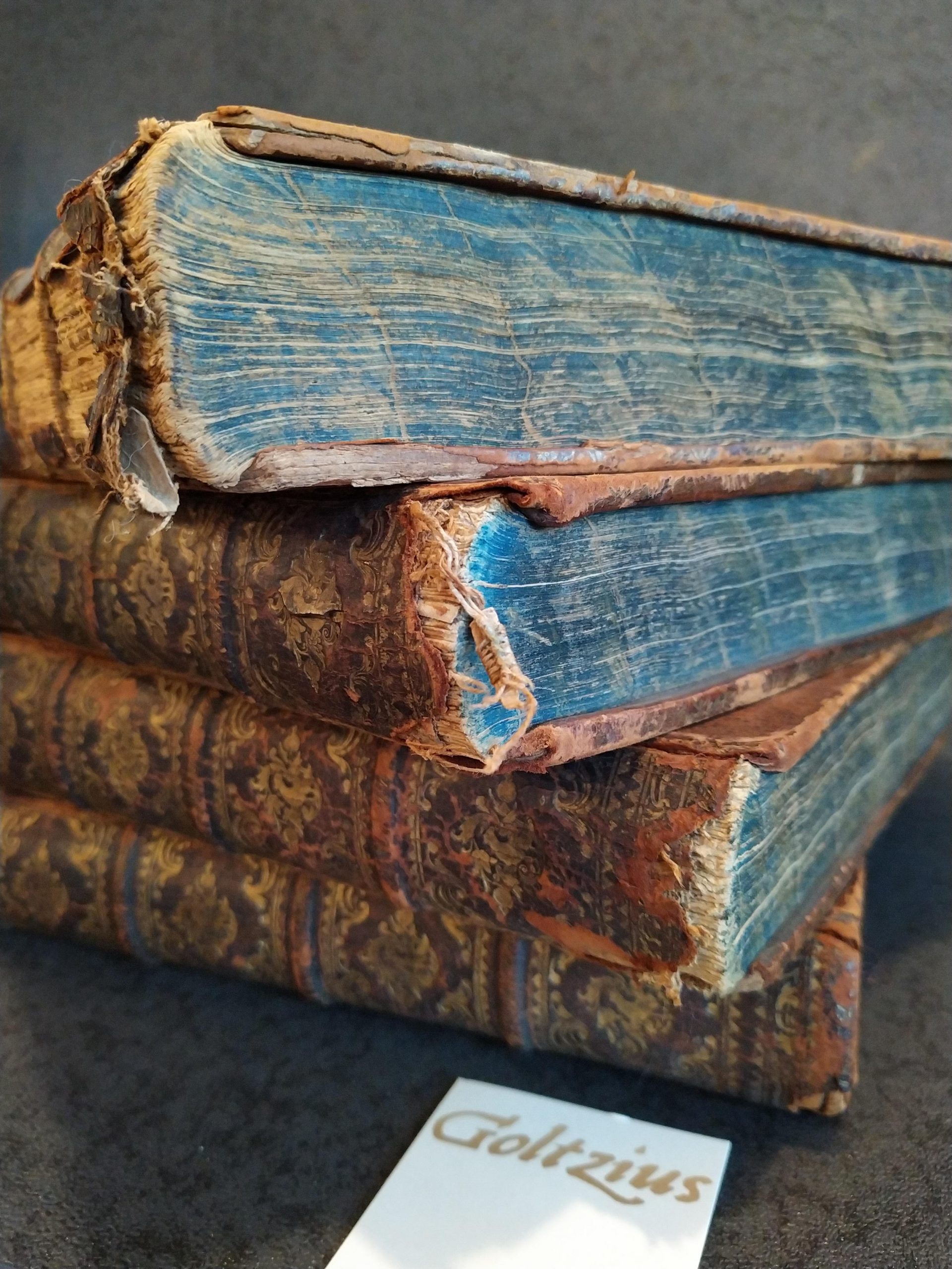 Amsterdam, Petrus Schenk, 1735, large folio, full leather binding, ribbed and goldtooled spine with titleplate, decorated edges, 8 volumes in 4 bindings, engraved printer's mark on the titlepages (each binding has one titlepage): Omnia tempore nota (Wandelaar inv. et fec. 1733), titlepages printed in red and black, with lovely decorative initials and endpieces. The leather on the spine of the first binding is damaged (less so on the other bindings) and there are some stains and damages, but overall very nice copies with clear printwork (in two columns) and beautiful engravings. Specifics of each volume:
