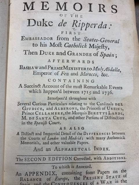 London: printed for John Stagg, in Westminster-Hall; and Daniel Browne, at the Black-Swan, without Temple-Bar. 1740, 1st edition, 8vo, xv, [i], 344 (8) index, 356-390 (appendix), [2], pages, with the appendix, some waterstaining to the first 50 pages, wormhole through the first 40 pages, 19th century half leather binding with the crest of the Constitutional Club Library in gilt on the spine, bookplate of Constitutional Club on flyleaf, ’the gift of the right honble Lord Colchester 1887′, hinges damaged and loose, repair on the inside, gilt lettering on spine, spine damaged, Reginald Charles Edward Abbot (13 February 1842 – 26 February 1919), 3rd Baron Colchester of Colchester from 1867, was a barrister and Conservative Party politician. The only son of Charles Abbot, 2nd Baron Colchester of Colchester and the Hon. Elizabeth Susan Law, he was educated at Eton College before being admitted to Christ Church, Oxford. He was President of the Union Society of Oxford in 1863 and graduated with an M.A. in 1864. In the latter year he became a Fellow of All Soul's College. He was Examiner in Law and History at Oxford University from 1869 to 1871. He was called to the bar at Lincoln's Inn in 1867. He unsuccessfully contested parliamentary seats on two occasions: at East Sussex in 1865 and at Devonport in 1867. Excellent provenance for this rare book. Written by John Campbell (1708-1775). An entertaining romantic history based around the life and diplomatic career of Jan Willem, Duke de Ripperda, with many amusing anecdotes drawn from the Moroccan and Spanish courts and a wealth of information and comment on both countries and the character of the two nations. Interesting comparisons are also drawn between the Spanish and English courts, in the final section. The detailed index at the end makes it a good tool for reference as well as a diverting read. This book combines the first 344 pages, the index and the appendix which brings the total of 390 numbered pages. Scarce and complete.