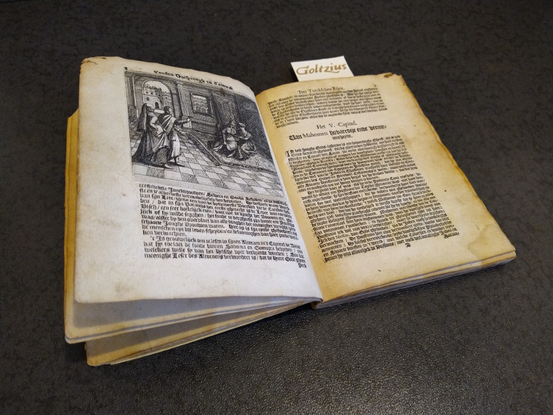 Amsterdam, Broer Jansz., 1640, 4to., marbled paper binding, [4]+119 pp., paper cover is worn along the edges and the spine, the bookblock is sewn well and still solid, the top right corners of the first signature are damaged, the other pages are intact, there is some waterdamage (especcially in the first two signatures of the book) and there are some other stains (an ink stain on the fore edge for example and in the sky part of the engraving on page 6). The book is printed in a Gothic font and illustrated with 9 beautiful engravings (anonymous). There is a vignette on the titlepage, some beautiful initials and a lovely endpiece.