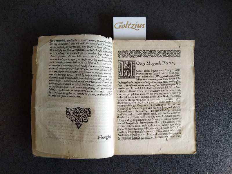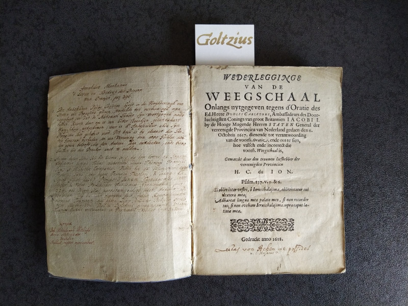 With some interesting contemporary handwritten notes in ink. On the titlepage: ‘Lucas von Achen me possidet, n. C. Hasaens d.’ On the page opposite the titlepage a reference to: ‘Arnoldus Montanus, 't Leven en Bedrijf der Prinsen van Oranje, pag. 396’ followed by a citation concerning a publication entitled ‘Waeg-schale’, published as a fierce statement against Ambassador Dudley Carleton and banned by law. The present work – ‘Wederlegginge van de weegschaal (…)’ – sets out to contradict the harsh words published in ‘Waeg-schale’. This Dutch note is followed by a note in Latin starting with some biographical information about the author of this book. Then there is another note: ‘Joh. Hildebrandi Withofii, anno MDCCXIV [1714] (…)’. Johann Hildebrand Withof (1694-1769) was professor of eloquence and history in Duisburg. He became famous for his history of the city of Duisburg. As a member of the Res Publica Litteraria, he was one of the last Latin poets.