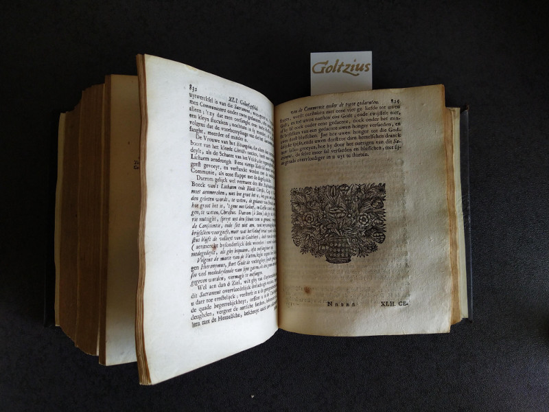 Ghendt, Gedruckt by d'Erfgenaemen van Maximiliaen Graet, 1710, 4to., full leather binding with brown leather on the spine (with blue linen titleplate) and black blind tooled leather on the front and back (IHS), [18]+1222+[2] pp. with some errors in the page numbering (42=24, and after page 832 the pagenumbers continue from 825 again), ex-library copy with several stamps: ‘Bibl. Dom. S. Bonifatii, IHS, 's Heerenberg’, ‘Biblio[theek] (…) Maastricht’, ‘Domus probat, S.J., Blyenbeek’ and ‘Bibliotheca Collegii Maximi S.J. Traiectensis’. Good copy: Solid bookblock with a few notes in the margins and hardly any stains. With lovely decorative initials and beautiful woodcut endpieces. Not in STCN.