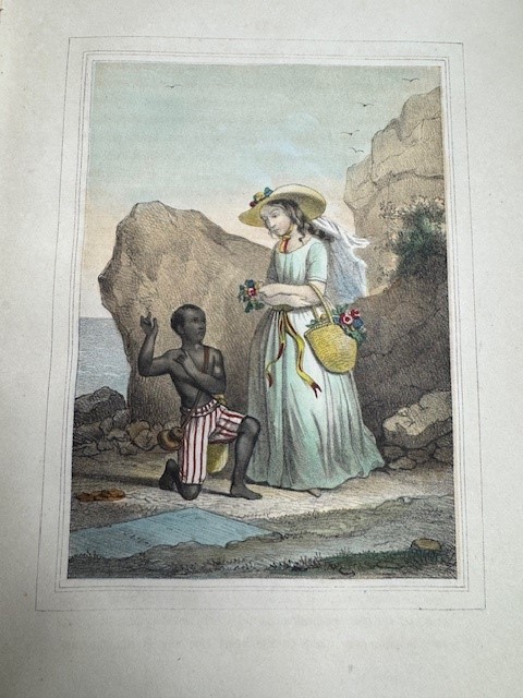 Amsterdam, G W Tielkemeijer, [1850], 98pp., [6] lithograph and beautifully handcoloured plates, attractive tooled linen binding, gilt title on front and spine, binding loose but still connected to block, plates are in pristine condition, no soiling. 1st edition, written by Elise who is Eliza Carolina Ferdinanda van Calcar (1822-1904). Contains the following stories: De jonge boschneger; Tevredenheid ; De godsdienstoefening in de grot ; Wanhoop nooit ; Hoolands bondgenoot.