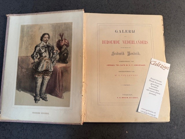 Utrecht, L.E. Bosch en Zoon, [1868], 1st edition, each section has its own pagenumbers, large chromolithograph plates with portraits and written biographies written by Jacob van Lennep (1802-1868). binding is suffering, the book is complete but the first few pages and plates are loose as well as the last few pages. Linen tooled binding, faded and damaged (spine), gilt ornaments on front, tooled back, gilt title on spine. Extensive list of those who ordered a book in advance.The most of these books were scrapped and the portraits sold seperately. This edition not in KB. Scarce.