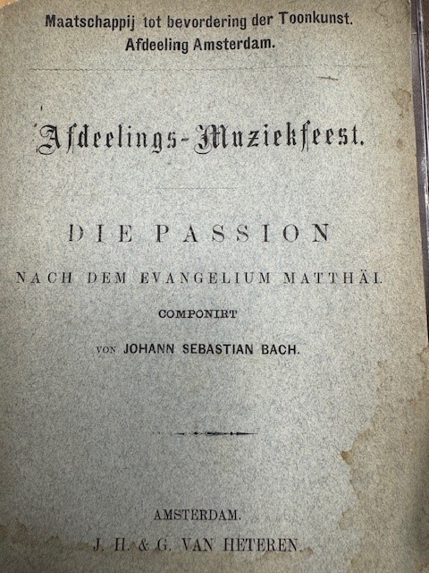 Amsterdam, J.H. & G. van Heteren, [1891], 36pp. original softcover binding, front loose, waterstain on fbottom of front, with the original ticket for a seat in Concertgebouw Amsterdam on 25 April 1891, and the leaflet for this performamce by conductor Julius Rontgen, with soprano Pia von Sicherer, alt Fanny Funk, Carl Dierich, tenor, Joh. Messchaert, bas, F.H. van Duinen, bas. With original leaflet (tear in upper left corner, waterstain on textbook. St Matthews passion/Matthaus passion is an old tradition in the Netherlands. Julius Engelbert Röntgen (9 May 1855 – 13 September 1932) was a German-Dutch composer of classical music. He was a friend of Liszt, Brahms and Grieg.In 1877 Röntgen had to make a decision whether to go to Vienna or Amsterdam. He chose Amsterdam, and became a piano teacher in the music school there. The aristocratic politician Alexander de Savornin Lohman, who was professor of law at the University of Amsterdam and an important figure in the cultural life of that city, was a friend of Röntgen's father, and he promised to take young Julius under his wing. According to Röntgen's letter of 1877 he considered the school ‘a place full of children and amateurs’; since the school was not supported by public funds, it appeared to attach more importance to the number of its students rather than their quality.