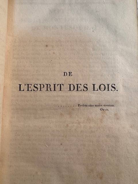 Paris, A. Belin, 1817, Oeuvres completes de Montesquieu, complete set in two volumes, xxxii, 769+ 632pp. leather bindings, top of spine of both volumes missing, marbled edges, gilt titles and ornaments on spines, with the complete Esprit des Lois and the analysis thereof. Notice sur la vie et les ouvrages de Montesquieu, Analyse de l'esprit des lois par Alembert and Grandeur des romains, lettres persanes, nice set.
