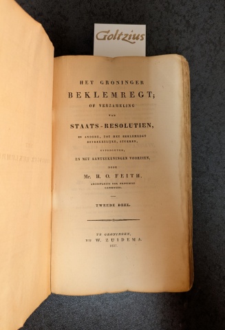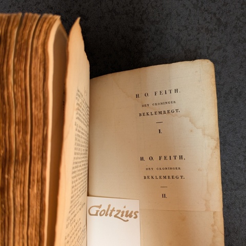 Groningen, W. Zuidema, 1837, 8vo., original paper binding. This simple publisher's binding was meant as a temporary binding, but in this case it was never bound to the owner's preference. In the back there is a page with the titles of volume 1 and 2. Presumably, the bookbinder could use these printed titles as titleplates on the spine.