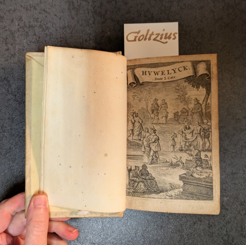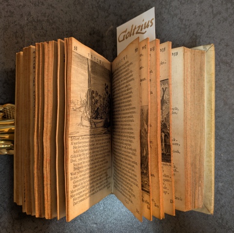 Amsterdam, I.I. Schipper, 1644, 8vo., full parchment spitsel binding, with handwritten title on spine and decorative blind tooling on front and back, with red and blue sprinkled edges. [22]+87+[10]+425+[15]pp., very good condition, solid construction, the endpapers have some spotted stains and there are two or three pages with a small tear in the margin, and one page with a torn corner (p. 367). With an engraved titlepage, some decorative initials, and 33 more engravings.